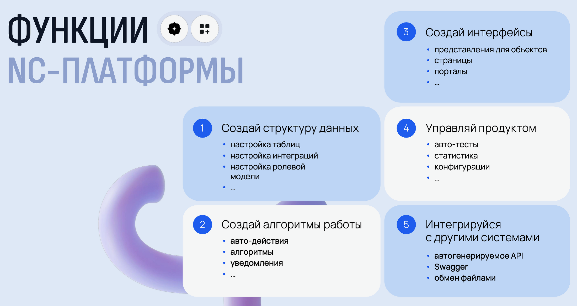 Существуют no-code платформы для разработки и запуска приложений без кода и no-code системы — приложения, автоматизирующие предметную область и обладающие now-code инструментами для настройки под клиента. Антон Симуни уверен, что оптимальным вариантом является внедрять no-code системы, созданные с помощью no-code платформ. Но для этого на no-code платформе должны быть реализованы определенные функции: создание структуры данных, алгоритмов работы, интерфейса, управления продуктом и интеграции с другими системами.