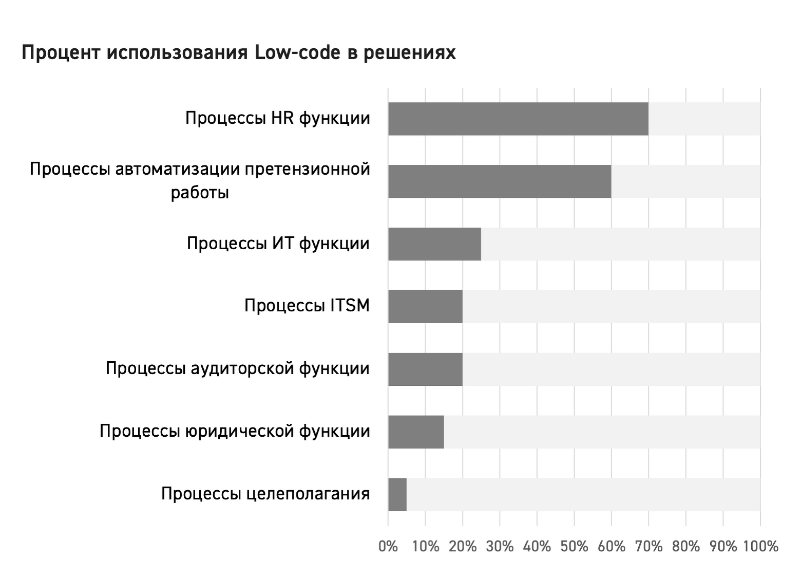 Еще одна задача — автоматизация рутинных процессов в подразделениях руками бизнес-пользователей. «Около 30% функционала средних и больших решений реализуется без написания кода», — говорит Анастасия Полянская. Она привела несколько примеров подобных кейсов. Благодаря применения low-code стоимость разработки сокращается на 15%, а готовые решения создаются на 30% быстрее.