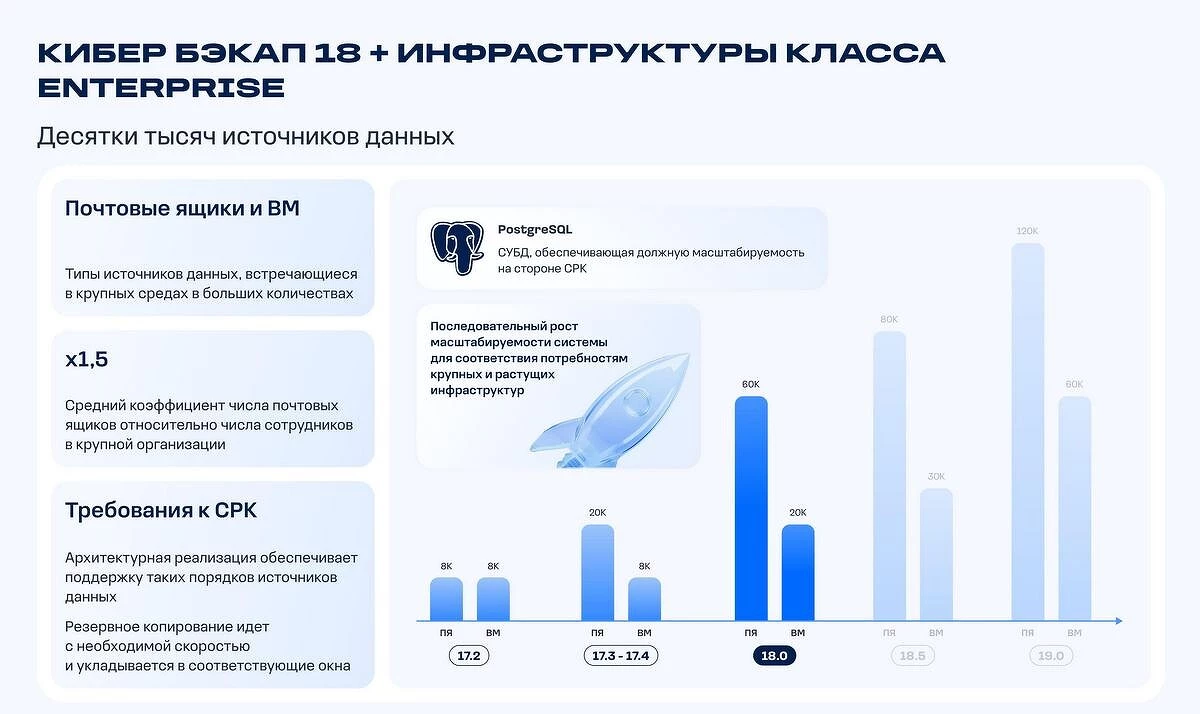 Версия 18.0 обеспечивает централизованную защиту крупных инфраструктур, включающих десятки тысяч источников данных. Теперь одна инсталляция системы может в ряде сценариев защитить до 60 тысяч почтовых ящиков и 20 тысяч виртуальных машин. Это соответствует потребностям крупнейших компаний, в том числе в сценариях роста инфраструктур и объемов обрабатываемых и хранимых данных.