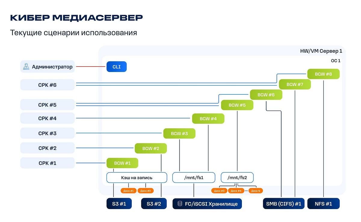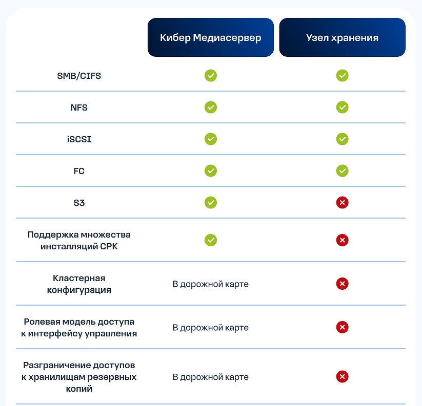 Эта версия с ограниченной функциональностью развертывается в качестве отдельного экземпляра на ОС Ред ОС 7.3 и размещает резервные копии, отправляемые агентами «Кибер Бэкапа», на локальных дисках сервера или в хранилищах, подключенных к медиасерверу по протоколам SMB/CIFS, NFS, iSCSI, FC, S3, в «Кибер Хранилище», СХД Yadro Tatlin.Backup и других популярных аппаратных и программных хранилищах резервных копий. В ней реализована возможность централизованного использования хранилищ резервных копий несколькими инсталляциями «Кибер Бэкапа», а также «Кибер Бэкапом Облачным» — сервиса резервного копирования «Киберпротекта».