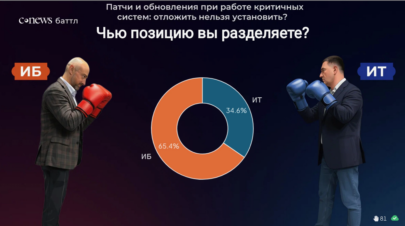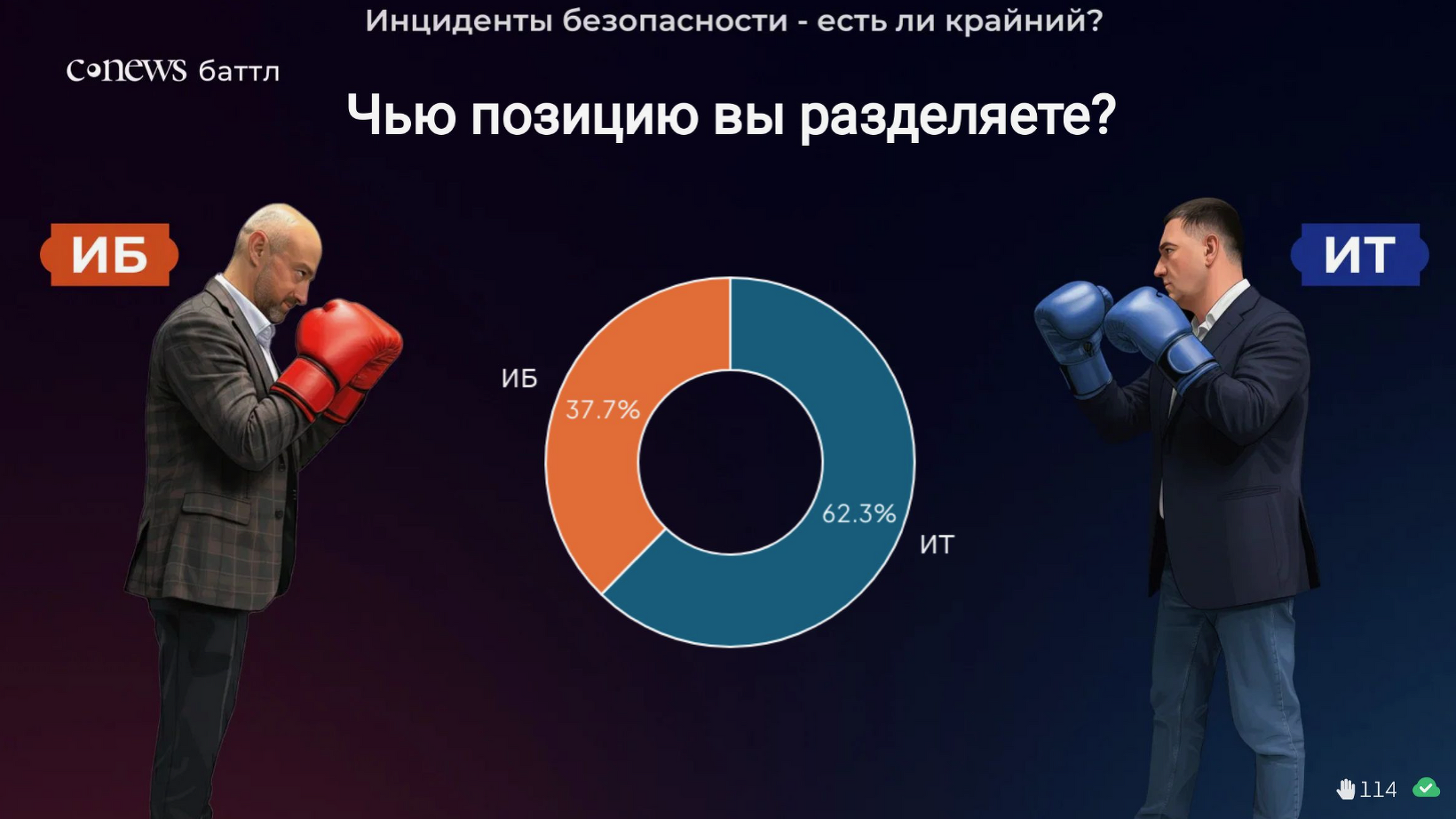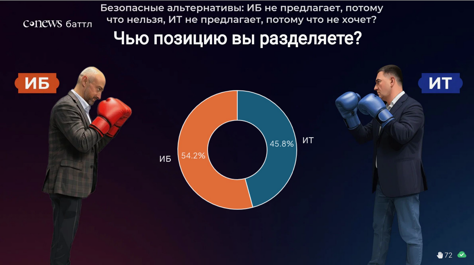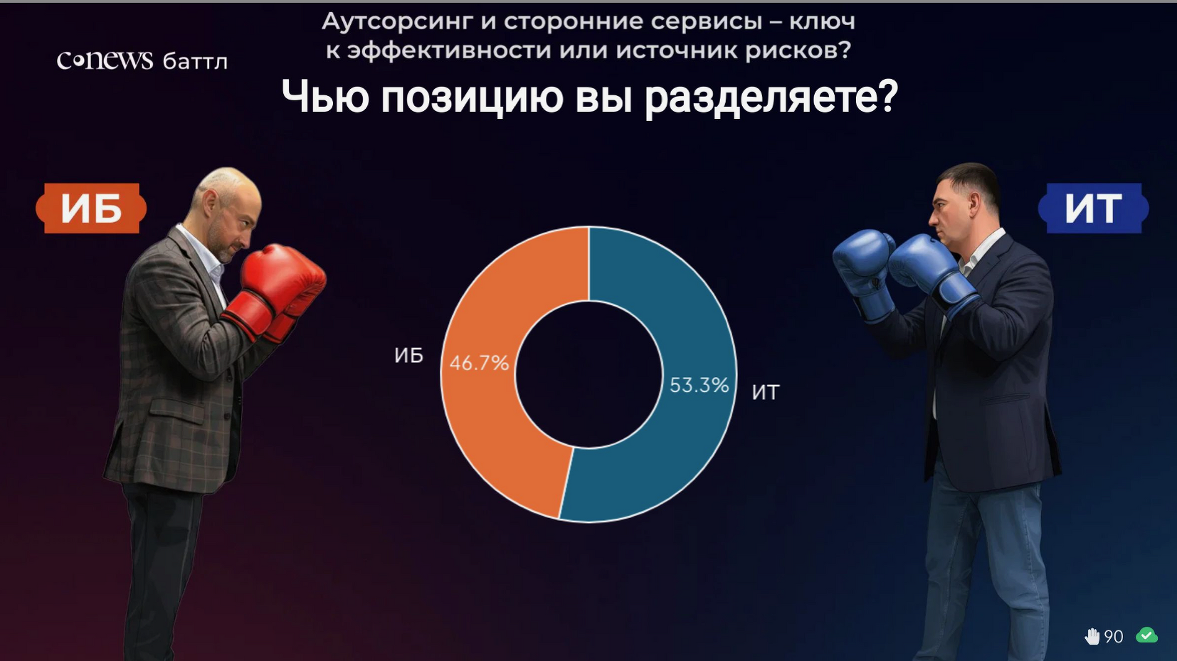 Работа специалистов в области информационных технологий и кибербезопасности далеко не всегда бывает спокойной и плановой. Достаточно часто это споры, отстаивание позиций и внутрикорпоративный бой. Посетители CNews Forum получили возможность принять участие в настоящем сражении «CNews Баттл». В ходе горячей дискуссии Вадим Григоренко, заместитель директора департамента информационных технологий Россельхозбанка, руководитель блока инфраструктуры «РСХБ-Интех», и Артем Калашников, управляющий директор Центра информационной безопасности дочерних и зависимых обществ Газпромбанка, пытались найти ответ на вопрос «Как ИБ-директору и ИТ-директору прекратить ссориться и начать дружить на благо бизнеса?». В качестве рефери поединка выступил Лев Фисенко, генеральный директор «Кросс технолоджис». Победителя каждого этапа «CNews Баттл» определяли зрители путем голосования.