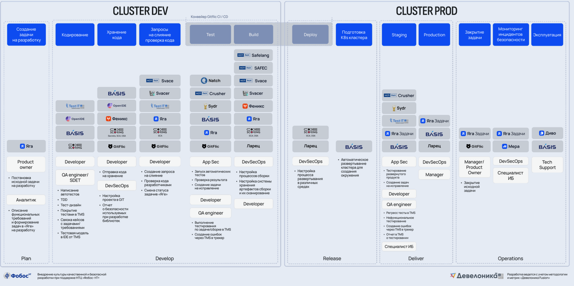 Конвейер включает в себя анализ кода на уязвимости с автоматическими проверками при каждом коммите, сканирование зависимостей для выявления небезопасных библиотек и компонентов, динамическое тестирование на наличие ошибок или уязвимостей, формирование отчетности и аналитики с прозрачными метриками для команды и руководства, а также интеграцию в CI/CD.