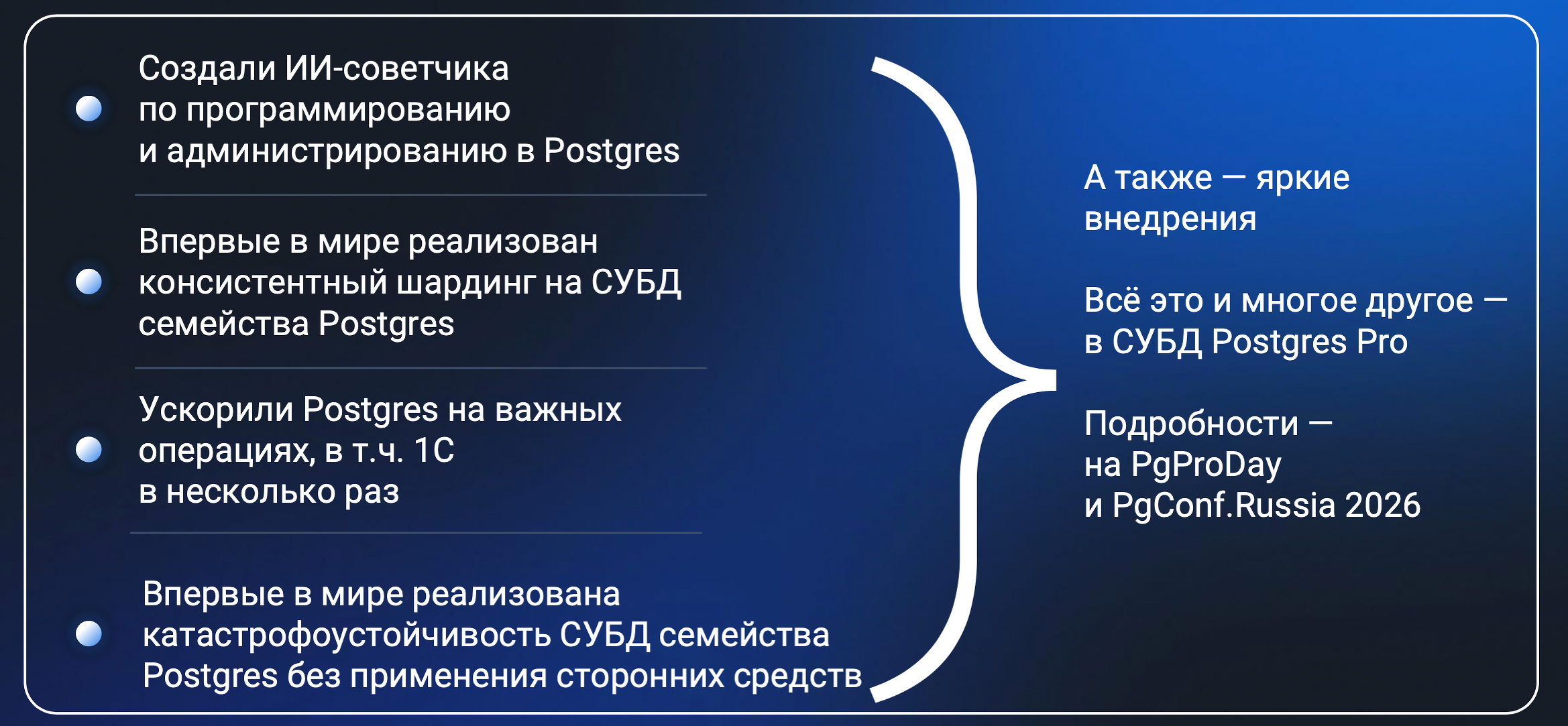 Активное импортозамещение длится уже три года, и число реализованных крупных проектов дает возможность сделать первые выводы. «Мы сделали отличный продукт — СУБД Postgres Pro», — уверен Иван Панченко, генеральный директор компании Postgres Professional. Компания все больше выходит за пределы Postgres и создает целую экосистему по работе с данными. В 2025 г. появился ИИ-советчик по программированию и администрированию в Postgres. Впервые в мире реализованы консистентный шардинг на СУБД семейства Postgres и катастрофоустойчивость СУБД семейства Postgres без применения сторонних средств. Разработчики ускорили Postgres на важных операциях, в том числе , в несколько раз.