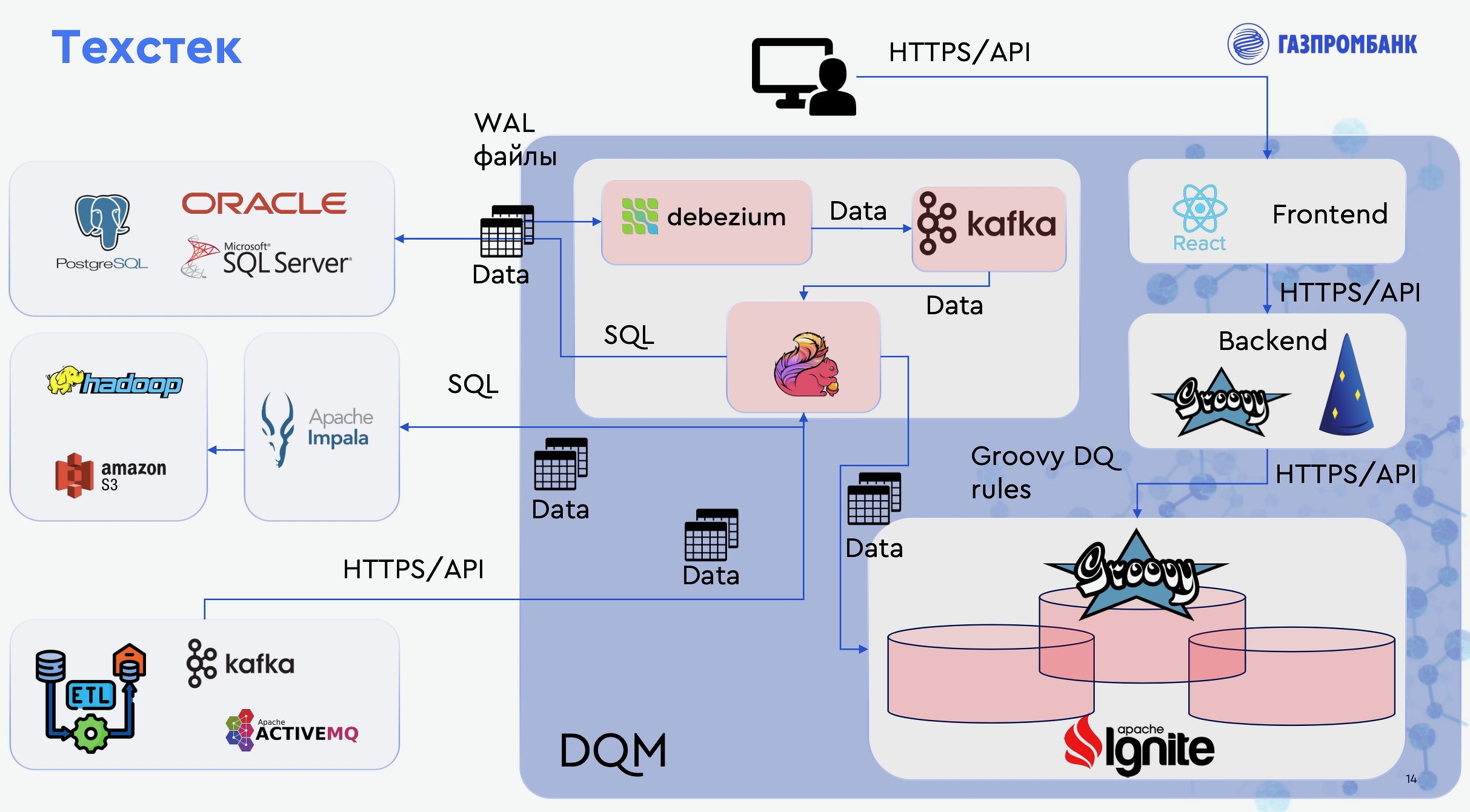 При создании платформы стоял выбор: использовать готовое решение или разработать его самостоятельно. Оценив все плюсы и минусы, Газпромбанк выбрал второй вариант. При внедрении приоритет отдавался широкому использованию зарекомендовавших себя open-source компонентов (OpenMetadata, Debezium, Ignite, Groovy и т.д.) в сочетании с собственной разработкой функционала, в первую очередь с использованием языка Java.