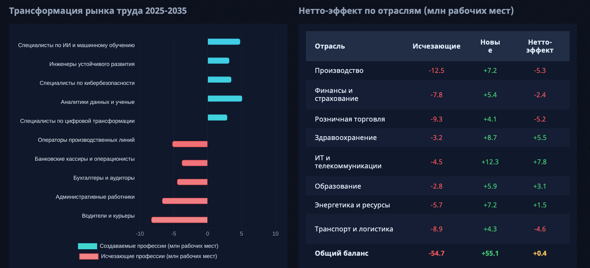 Источник: WEF Future of Jobs Report 2025, McKinsey Global Institute, OECD Employment Outlook 2023-2025