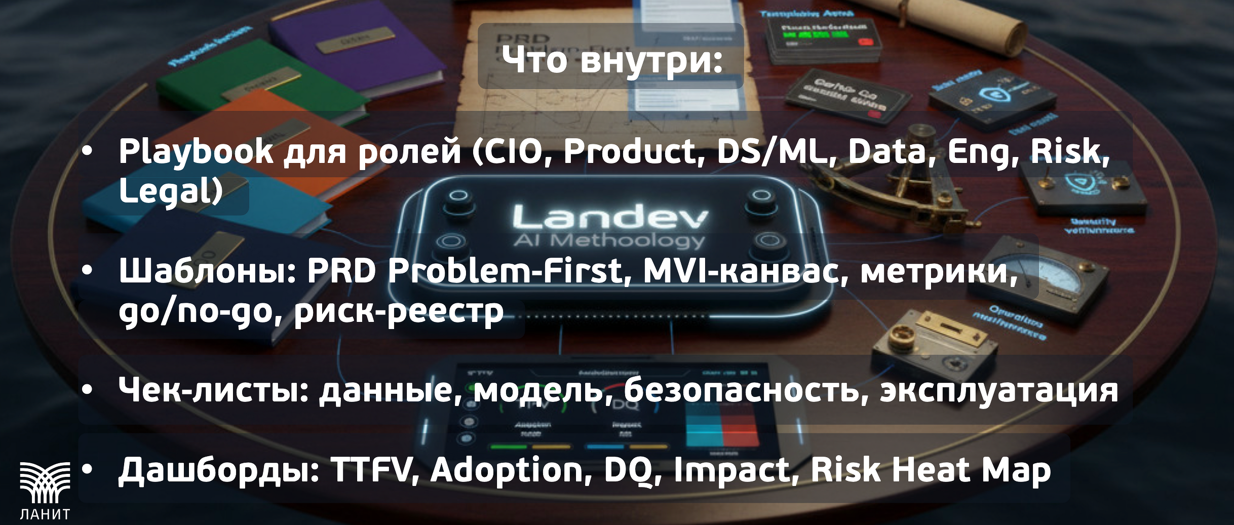 LanDevAI помогает комплексно решать задачи управления жизненным циклом ИИ-проектов. Решение дает возможность быстро запускать любые ИИ-модели, обеспечить единую точку доступа к ИИ-ресурсам, в том числе к данным, контролировать метрики качества и бюджет, организовать мониторинг использования и управление версиями моделей. Кроме того, ЛАНИТ предлагает framework управления рисками ИИ-проекта. «Надо быть готовым к тому, что, возможно, проект придется остановить через 2 недели после старта», — предупредил Артем Сусеков.