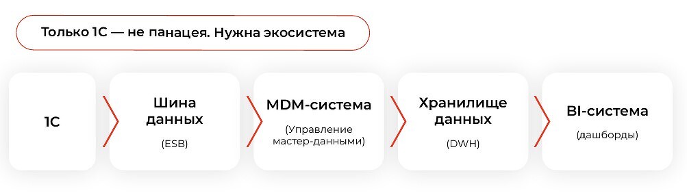 Однако BI-аналитика — это лишь верхушка айсберга. Без качественных данных и правильной архитектуры она бесполезна, напоминает Алексей Петухов. Успех зависит не от функций 1С, а от архитектуры данных вокруг нее (MDM, ESB, DWH). «Не ищите альтернативу 1С. Ищите способы заставить ее работать на современные бизнес-задачи», — предлагает спикер.