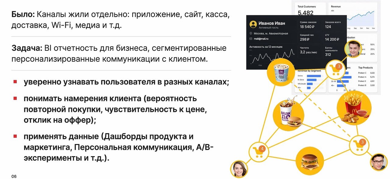 Полгода работ, десятки вовлеченных людей и осознание всей величины айсберга — история типичная. Иван Беляков приводит конкретные примеры из жизни. Компания АДВ разрабатывала кастомную CDP для «Макдональдса», работала с «Супермаркетом данных» для «Сбера», поэтому теперь смело может давать советы и делиться полученными в ходе проектов инсайтами.