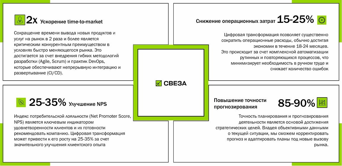 Цифровая трансформация формирует условия для инноваций, улучшает скорость принятия решений и способствует развитию конкурентных преимуществ на быстро меняющемся рынке. «Свеза» определила для себя задачу так: нужно создать технологическую базу для формирования новых бизнес-моделей, стратегий развития и способов создания ценности.