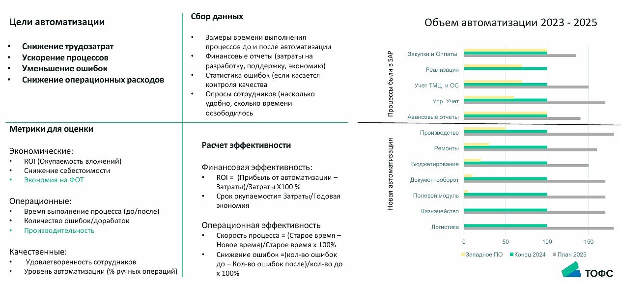 Если в 2023 году ТОФС пыталась выжить и ради этого «насиловала», как выразилась докладчица, 1С, то к 2025 году ситуация изменилась. Вместо «дикого Agile» тут начали придерживаться классической проектной методологии с разделением функционала на MVP (хотя и Scrum, и Kanban продолжают использоваться). Техническая и пользовательская проектная документация вновь ведется, вводится согласование процессов. Как и два года ранее, в качестве основных экспертов используют руководителей, но с большим акцентом на ведение проекта со стороны project manager и привлечением других экспертов от бизнеса.