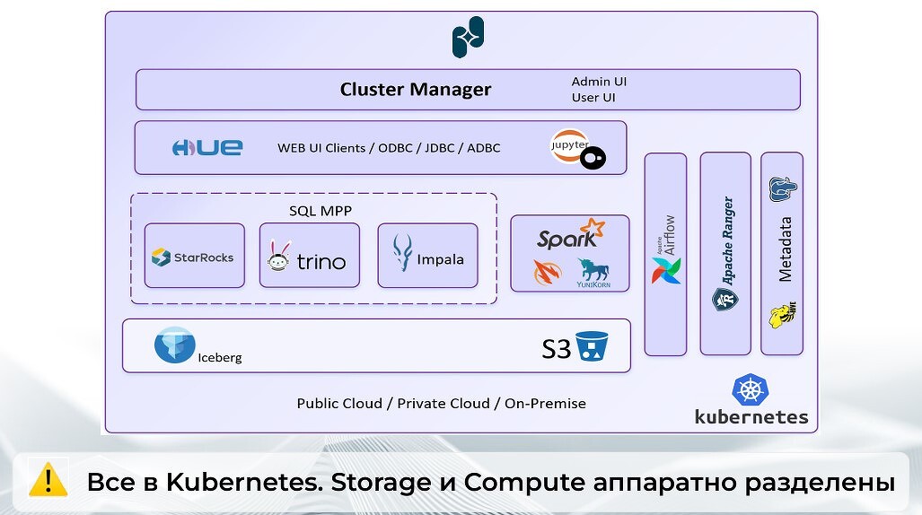 Пока банк продолжает жить сразу на нескольких решениях: остались «кусочки» Greenplum, продолжается миграция со стека Oracle. Часть хранилища находится в облаке от «Яндекса», а остальное переезжает в новую Lakehouse Nova. Но в будущем планируется перейти на единую платформу.