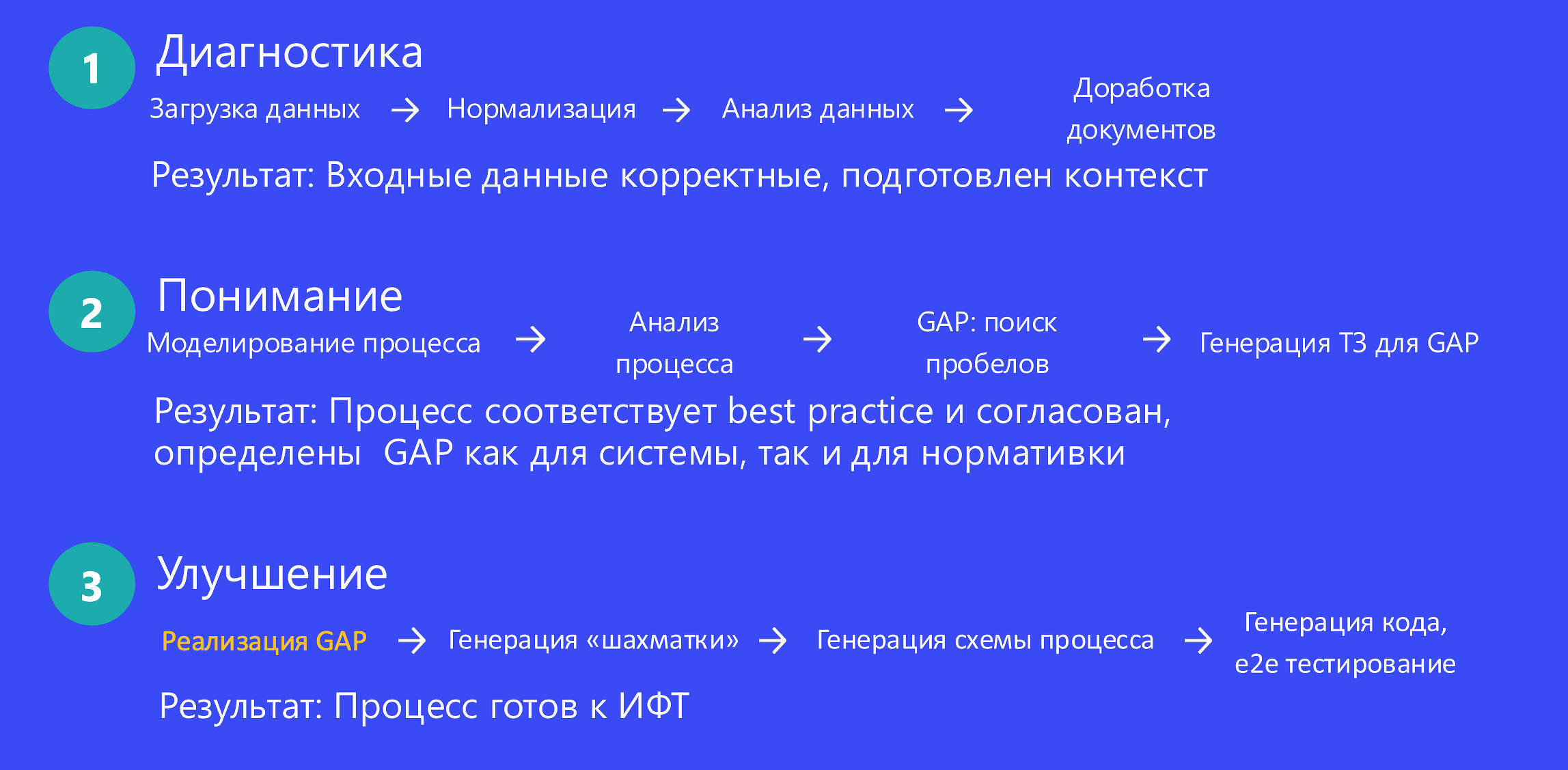 Алексей Шершнев, ИТ-директор Farzoom, поделился кейсом создания кредитного конвейера в небольшом банке. Перед компанией стояла задача внедрить полнофункциональный процесс за 1 мес. Для того, чтобы ее решить, использовали ИИ-генерацию процесса. Сначала провели диагностику — изучили документы банка, для их распознавания, семантического анализа, поиска противоречий использовали ИИ-агентов.