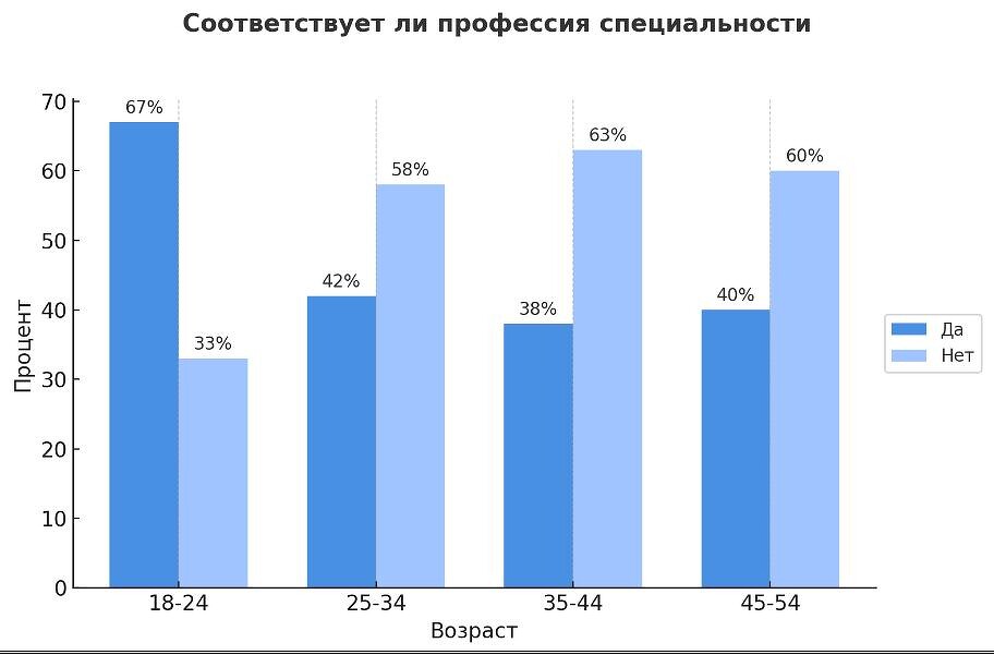 По сравнению с 2024 г. количество вакансий в 2025 г. снизилось на 12%, а число резюме выросло на 14% (данные hh.ru). При этом молодежь демонстрирует более осознанный выбор профессии: 67% опрошенных в возрасте от 18 до 24 лет уже работают или стажируются по специальности, нарабатывая опыт, а среди респондентов старше 25 лет этот показатель составляет 40%.