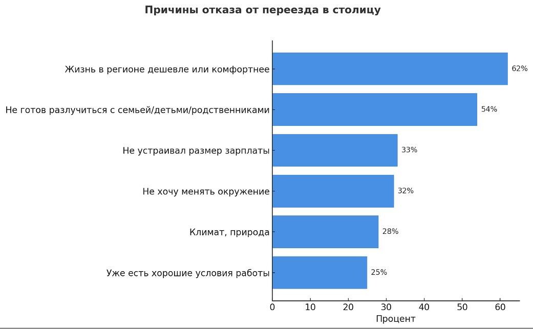 Формат удаленной работы в компаниях из мегаполисов выбирают 38% региональных ИТ-специалистов, причем чаще всего такой вариант предпочитают в Татарстане (48%), Самарской области (48%) и Краснодарском крае (46%). При этом сотрудники из регионов не спешат менять место жительства ради карьеры: каждый четвертый опрошенный (26%) получал предложение о переезде в Москву или Санкт-Петербург, однако согласились лишь 7%. Основные причины отказа — более низкая стоимость жизни в регионах (62%) и нежелание разлучаться с семьей (54%). В то же время развитие филиалов крупных ИТ-компаний в регионах может стать драйвером роста: 37% специалистов рассмотрели бы переход в такой филиал, если бы он открылся в их городе. Наибольший интерес к этому проявляют в Татарстане (52%) и Самарской области (48%).