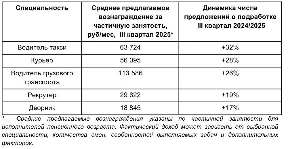 Заметнее всего увеличилось число смен для исполнителей пенсионного возраста на позиции водителя такси — в III квартале 2025 г. бизнес почти на треть чаще (+32%) предлагал подработку по сравнению с 2024 г. В среднем пенсионеры здесь могли рассчитывать на 63 724 руб. в месяц при частичной занятости.