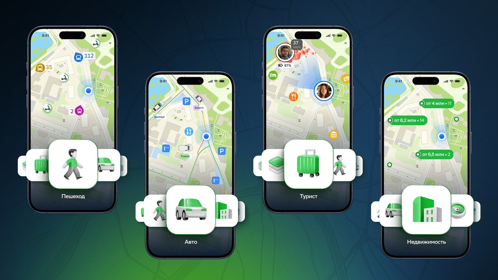 Для тех, кто передвигается по городу пешком, на самокате или на общественном транспорте. Помогает ориентироваться в городе и подстраивается под потребности пешехода: показывает переходы, широкие тротуары и тропинки. Отображает самокаты и зоны проката. Показывает, где находятся друзья на карте (при включенной функции) и скрывает автомобильные элементы: заправки, парковки или камеры контроля скорости.