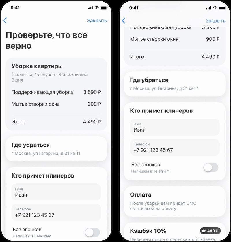 Во время заказа услуги клиент выбирает необходимые параметры, в том числе тип уборки (поддерживающая, генеральная, уборка после ремонта или мойка окон), количество комнат, санузлов, а также может при необходимости заказать дополнительные услуги — например, глажку белья или дезинфекцию поверхности. Статус заказа можно отслеживать в разделе «Уборка».