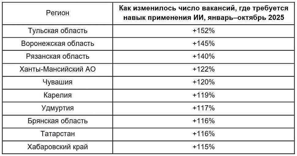 На первом месте по росту числа вакансий с требованием навыков применения ИИ — Тульская область: в январе-октябре 2025 г. количество таких позиций здесь выросло более чем в 2,5 раза (+152% год к году). На втором месте — Воронежская область (+145%), на третьем — Рязанская область (+140%).