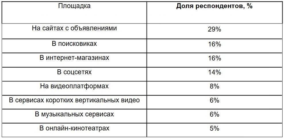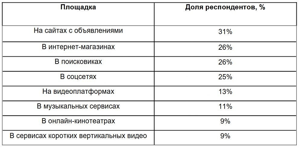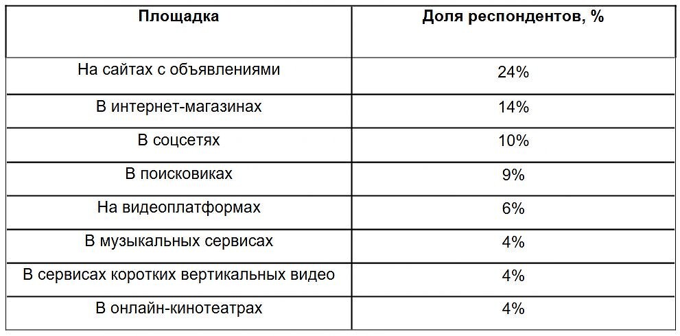 Сайты с объявлениями и маркетплейсы занимают лидерские позиции среди площадок, реклама на которых в последний раз привела к покупке: об этом рассказали 24% респондентов. Реклама в интернет-магазинах побуждает к покупке 14% участников опроса, в соцсетях — 10%, а в поисковиках — 9%. В меньшей степени мотивирует к покупкам реклама на видеоплатформах (8%) и в музыкальных сервисах (6%).