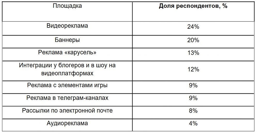 Если говорить про топ форматов, которые воспринимаются пользователями лучше всего, то первое место занимает видеореклама — за нее проголосовали 24% опрошенных. На втором месте располагаются статические баннеры: им отдают предпочтение 20% респондентов. Реклама в формате «карусели», где в одном баннере показывается сразу несколько товаров, получила 13% голосов. Еще 12% предпочитают нативные интеграции у блогеров и в видеошоу.