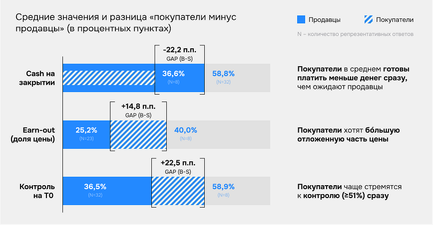 Исследование показало, что для успешного поглощения участникам сделки критически важна не столько цена, сколько механика структурирования сделки. Структура — это главный источник «трения»: покупатель хочет меньше денег на старте, больше earn-out и выше стартовый контроль, продавец — наоборот.