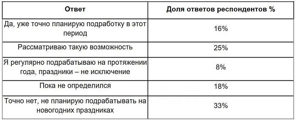 В новогодние праздники 16% опрошенных планируют подработку, еще 25% рассматривают такую возможность. Регулярно подрабатывают в течение года, в том числе в праздничные дни, 8% респондентов. Пока не определились 18% респондентов, а треть (33%) не планируют дополнительную занятость. Таким образом, значительная часть респондентов (40%) допускают или уже запланировали подработку в этот период.