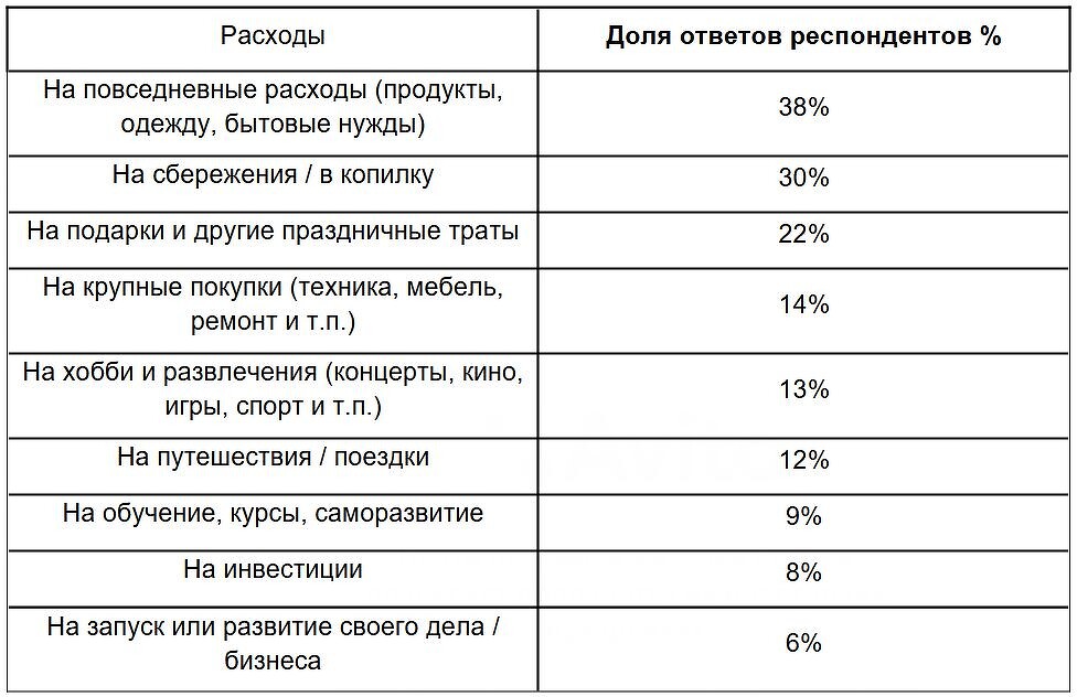 Дополнительный доход жители России чаще всего планируют направить на повседневные расходы — продукты, одежду, бытовые нужды. Так ответили 38% респондентов. Сбережения назвали 30%, при этом почти четверть (22%) собираются потратить средства на подарки и другие расходы к праздникам. Крупные покупки, например технику, мебель или ремонт, рассматривают 14%. Еще 13% направят средства на хобби и развлечения, 12% —на путешествия, а 9% — на обучение и саморазвитие. На инвестиции и на запуск собственного дела планируют направить доход 8% и 6% респондентов соответственно.