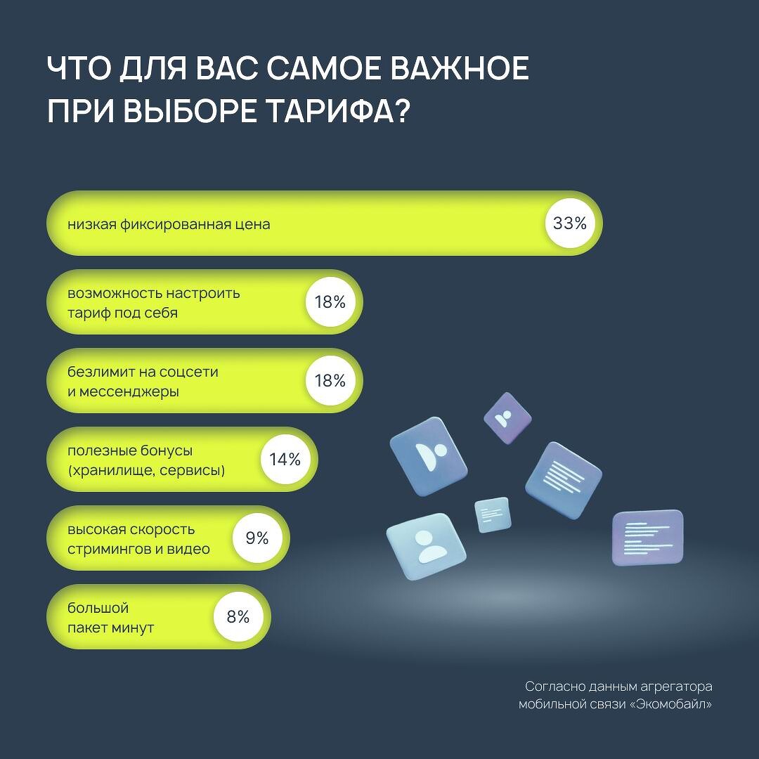 Агрегатор мобильной связи «Экомобайл» провел исследование и выявил основные предпочтения пользователей при выборе тарифного плана. Согласно исследованию, абонентам сегодня важна в первую очередь качественная недорогая мобильная связь, а не дополнительные услуги. При этом многие хотели бы настраивать тариф индивидуально, под свои нужды. Об этом CNews сообщили представители «Экомобайл».