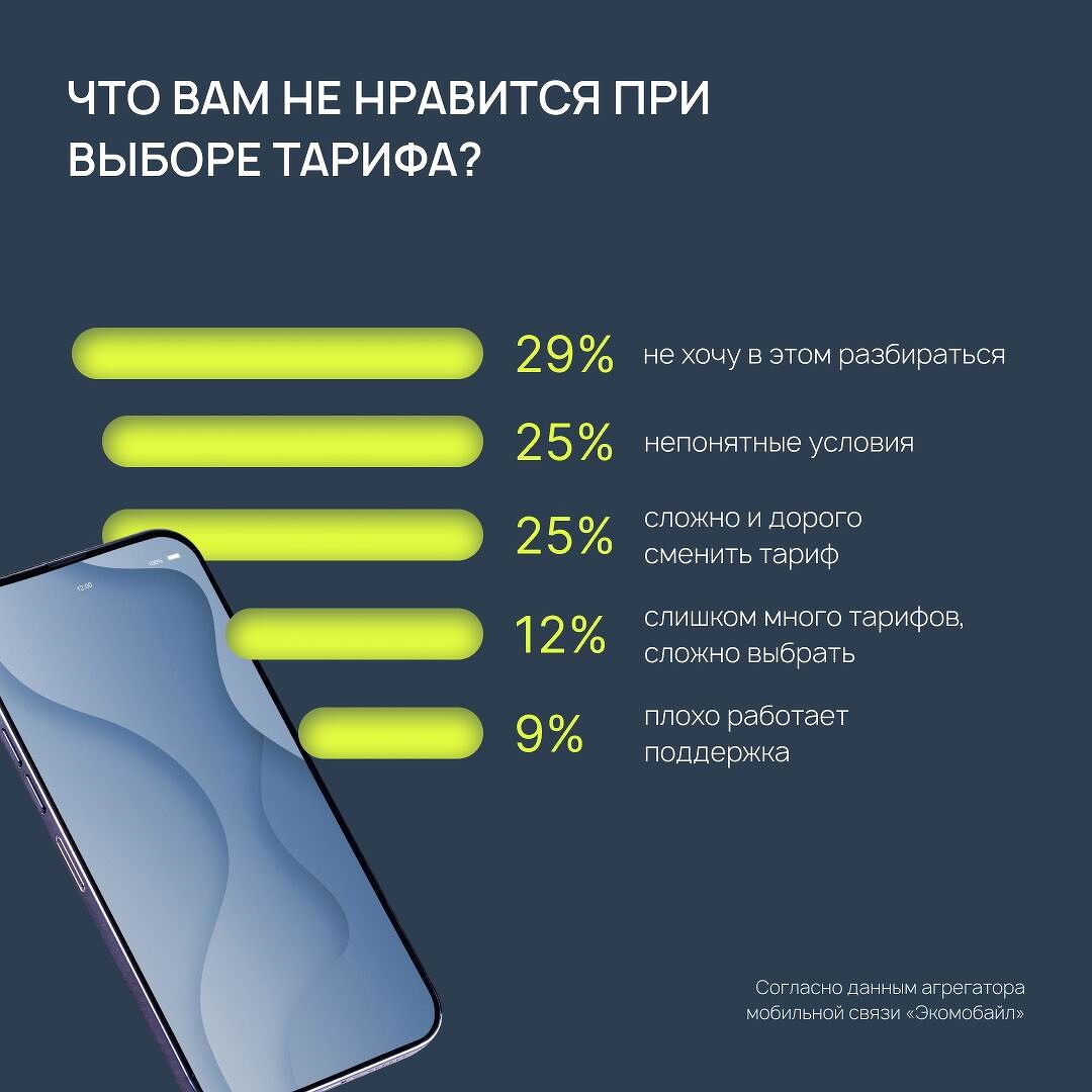 Больше четверти абонентов (29%) признались, что вообще не хотят разбираться в деталях новых предложений от операторов. На непонятные условия тарифных планов, а также на сложность и дороговизну процедуры смены тарифа или оператора указали по 25% опрошенных. Еще 12% пользователей отмечают, что из-за слишком большого выбора тарифов им сложно принять решение. 9% абонентов жалуются на работу поддержки оператора.