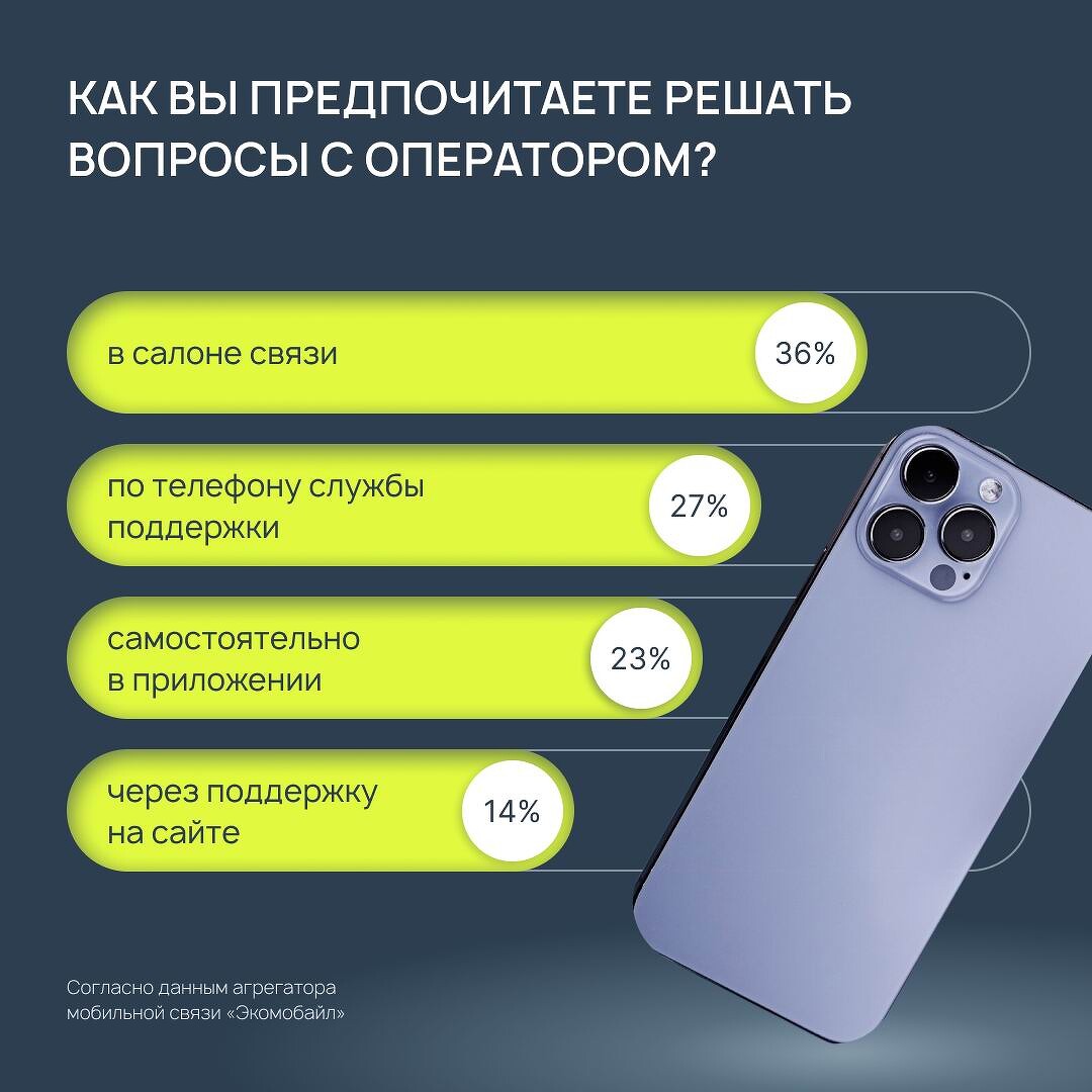 Несмотря на повсеместную цифровизацию, абоненты предпочитают решать вопросы при личном контакте: в салоне связи оператора (36%) или же по телефону службы поддержки (27%). При этом значительная доля пользователей (23%) ценит возможность решить все вопросы самостоятельно в приложении, а 14% обращаются за помощью через сайт.