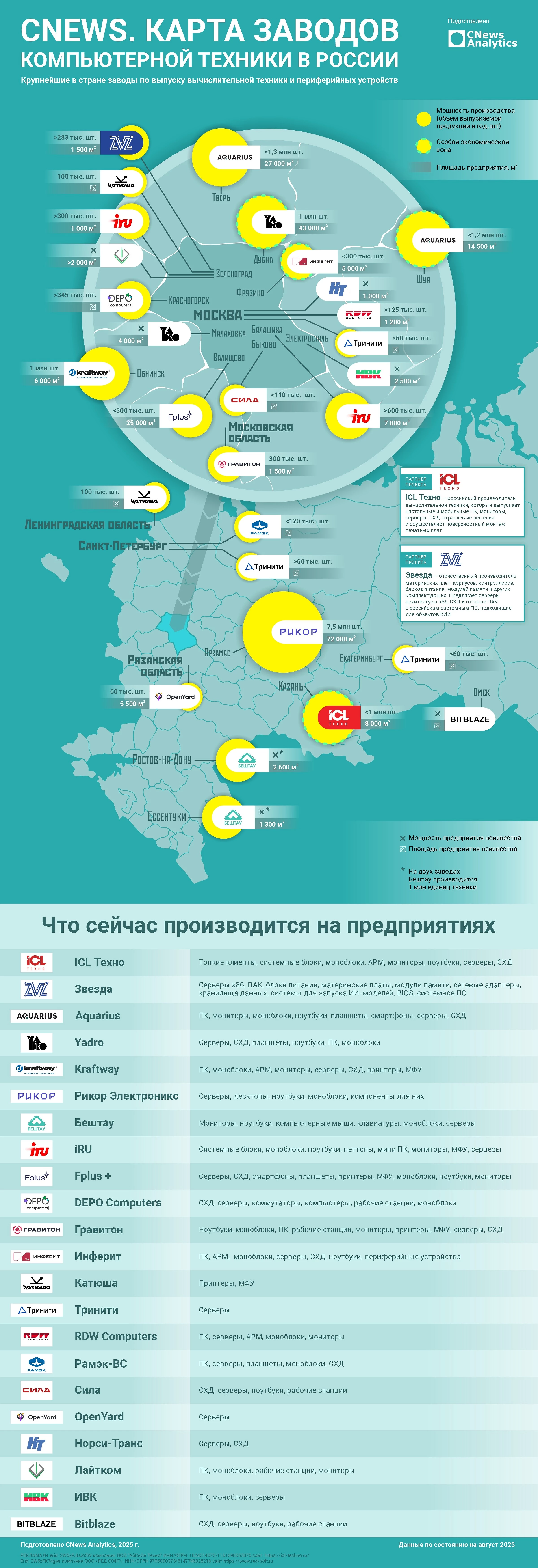 Издание CNews публикует карту заводов компьютерной техники в России, на которой отражены мощность производств и площадь предприятий.