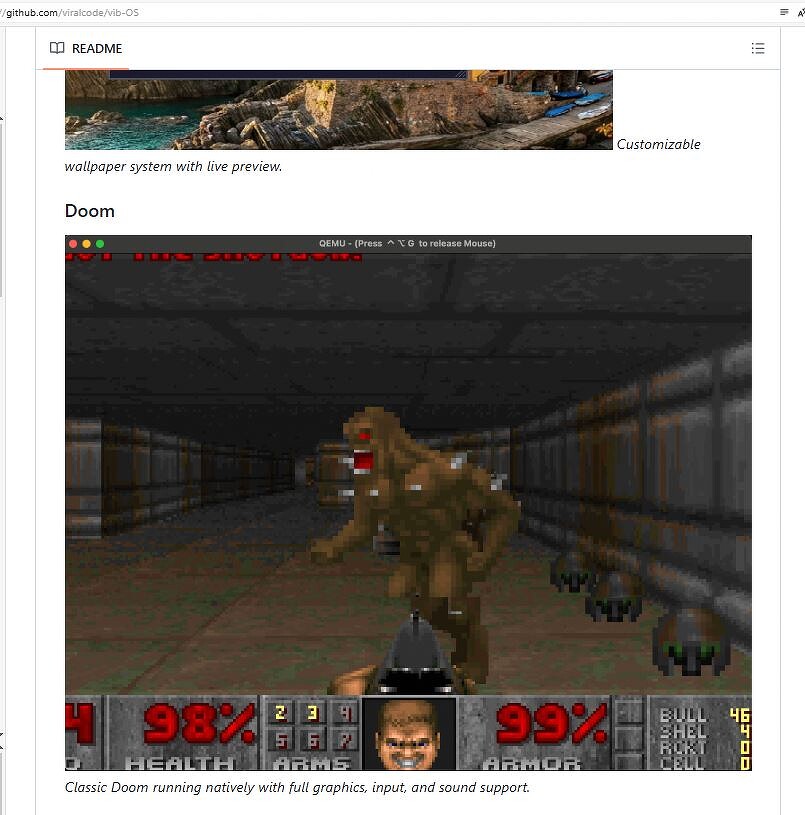В описании к Vib-OS на GitHub есть несколько упоминаний Doom и даже скриншоты из нее, но пользователю Tirimid не удалось запустить ее под этой ОС.